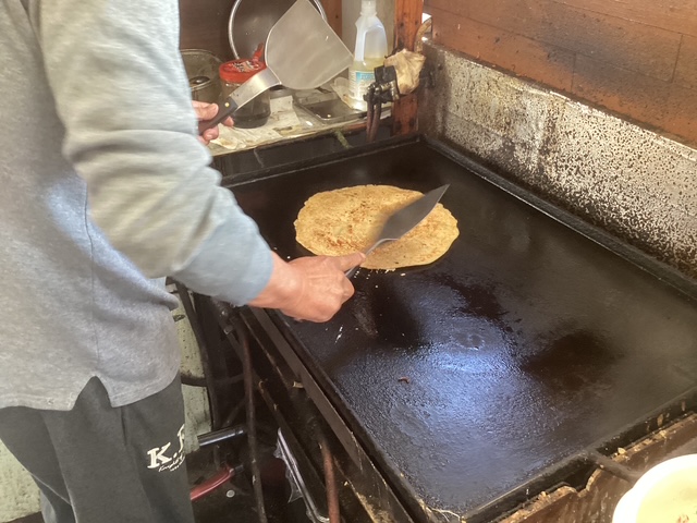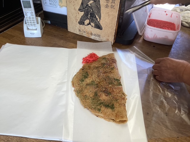 へぇ~具が豚バラ、キャベツ、ネギ、天かす、を少しずつ散らしている、